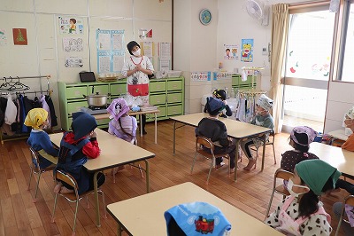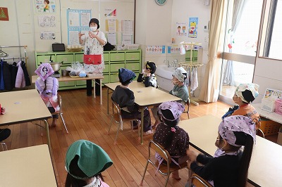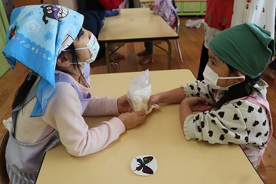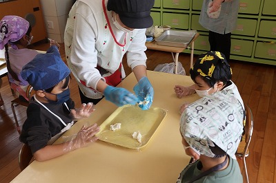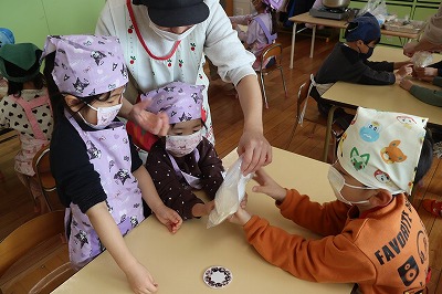 子どもたちは、だご汁について説明を聞いた後、袋に入っている小麦粉にお湯を入れてこねていきました!