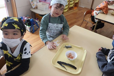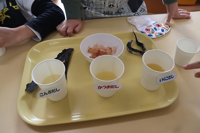 こねた小麦粉を30分間寝かせている間に、「かつおだし・いりこだし・昆布だし」の飲み比べをしました!どんな違いがあるか興味津々の子どもたち✨子どもたちそれぞれが、好みのだし汁を発見できたようでした💗