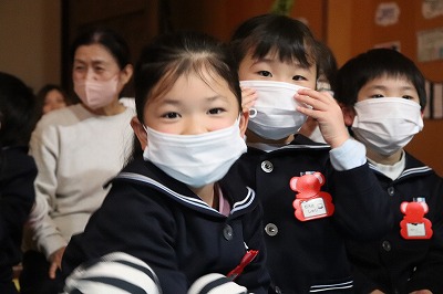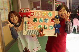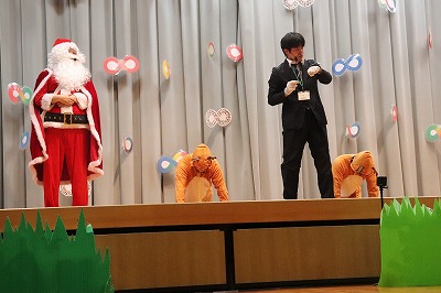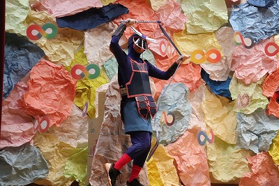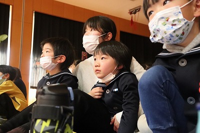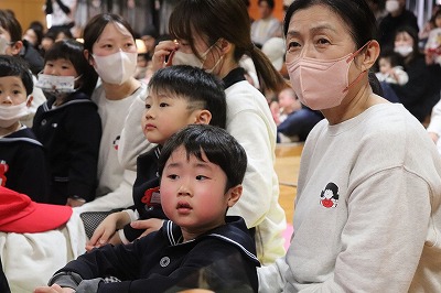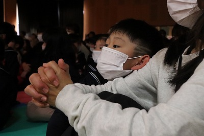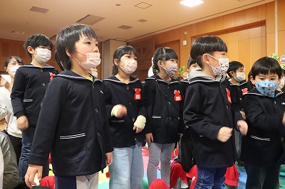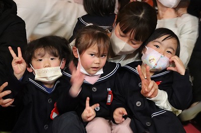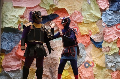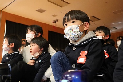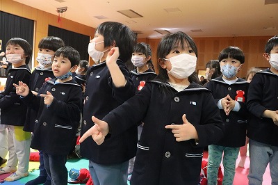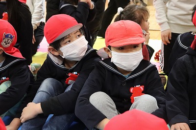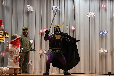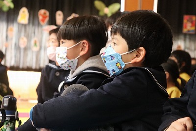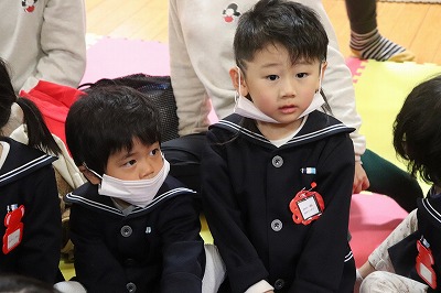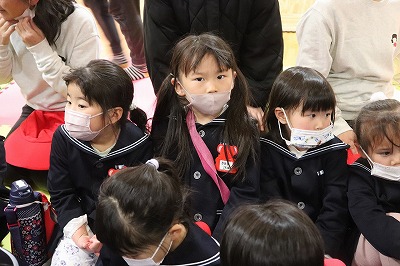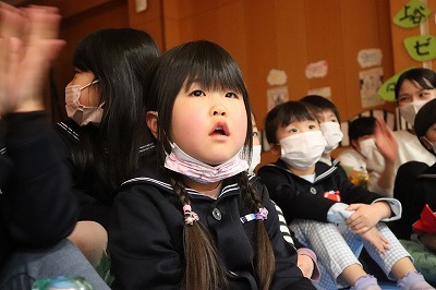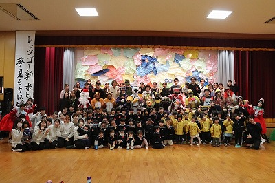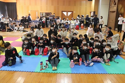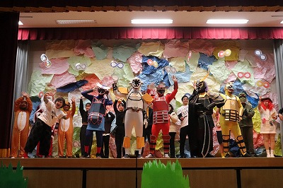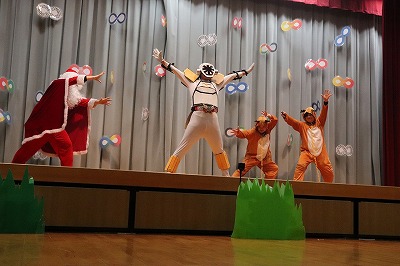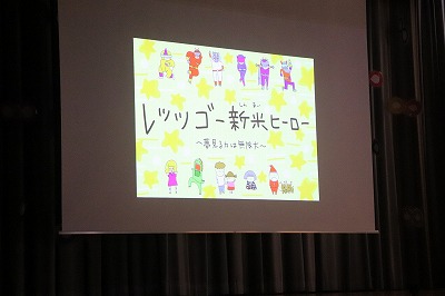 『レッツゴー新米ヒーロー』スタートです▶️みんな真剣に劇を見ていました👀ヒーローに変身する場面もとてもかっこよく、悪者と戦う場面では一生懸命応援していました✨そしてお父さん役のかえで先生、ブルー役のなおき先生が出てくると嬉しそうな子どもたちでした😊