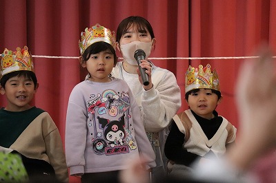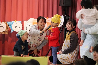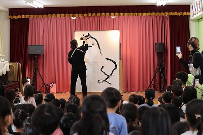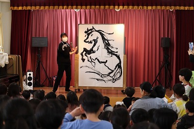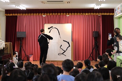 先生の出し物では、りかこ先生による書道・絵パフォーマンスでした!何が始まるのかドキドキワクワクの子どもたちと先生たち・・・💗「うま」という字からだんだん馬の姿が出てきました!息をのむほどの迫力に会場のみんなが釘付けでした✨午年ならではのパフォーマンスがとってもかっこよかったです👏何事もうまくいきますように~と願いを込めて💕