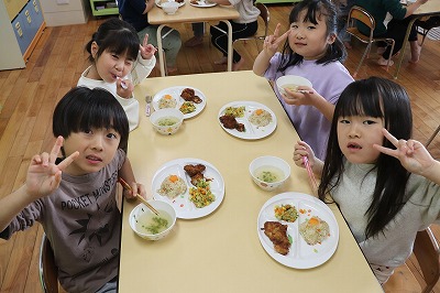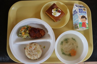 今月のお誕生会メニューは、〇和風ツナごはん〇チキンカツ〇白菜のごま酢和え〇そうめん汁でした!おやつは、〇牛乳〇さつまいもチーズケーキでした🍴どれもとっても美味しかったです💗ごちそうさまでした😊