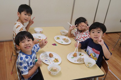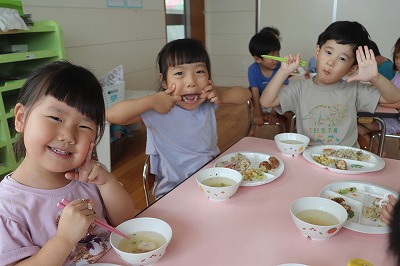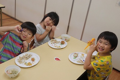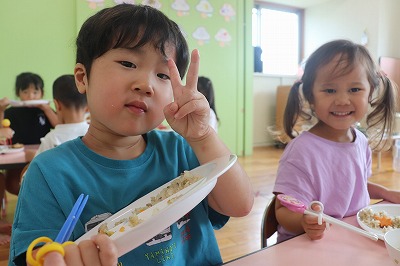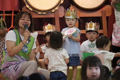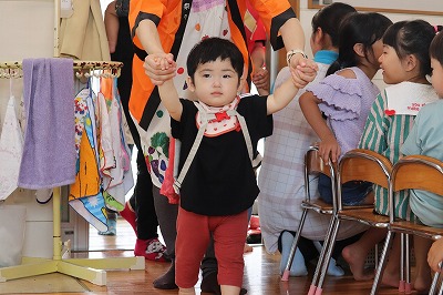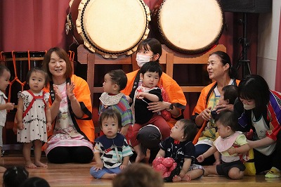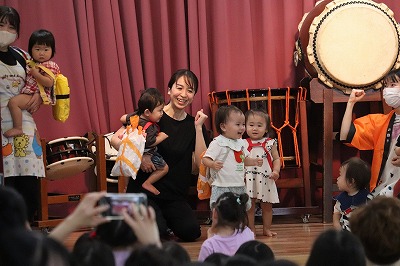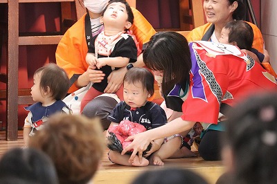 「ぼくはおすしのご・は・ん~♪ちいさなちからもち~♪💪」いくらやえび、まぐろにたまごとお寿司になって出てきてくれました(*^-^*)すみれ組さんが横を通るとかわいい~!!と大声援が上がりましたよ😊