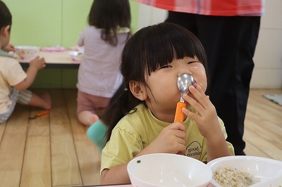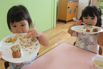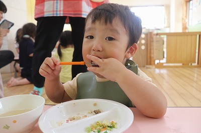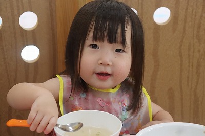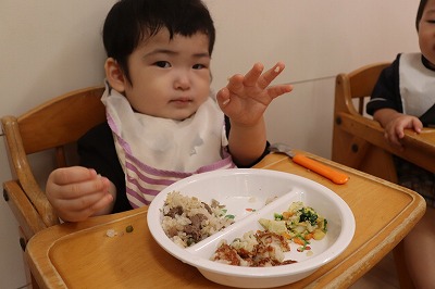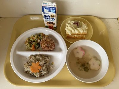 お誕生会メニューは、〇きのこの炊き込み〇お魚ボール〇和風マヨ和え〇花麩のすまし汁でした🍴✨🍁
