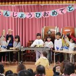 今月の子どもたちの出し物は、たんぽぽ組さんでした🌼先生がケーキを持ってきたけれど・・・あれ?しまった!!💦飾りつけを忘れていました!💦そんなとき、エプロン姿のかわいいたんぽぽ組さんがお手伝いをしにきてくれました💕いちごやみかん、キウイなどおいしそうなフルーツがたくさん✨とっても素敵に飾りつけできましたね😊